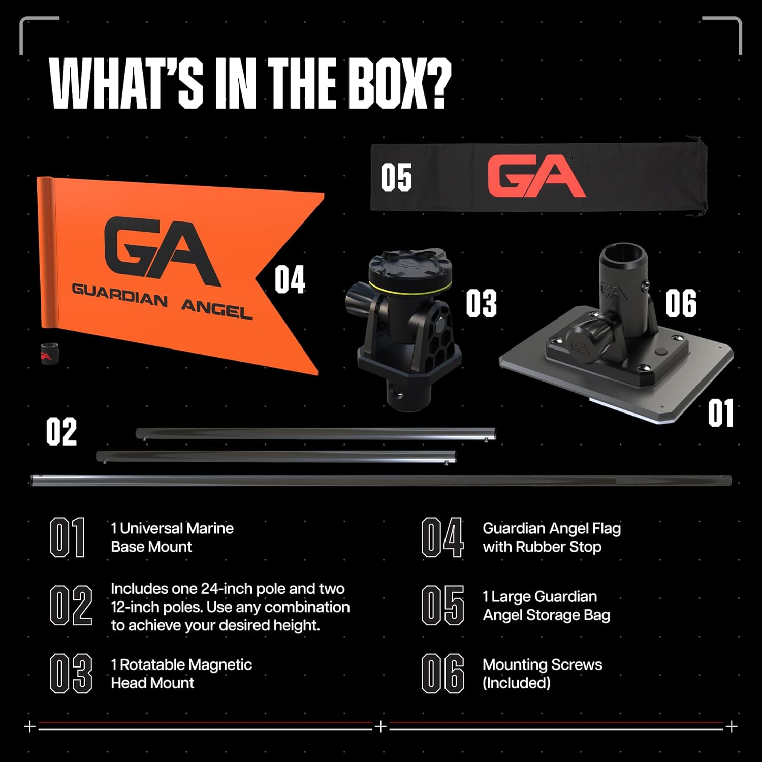 Guardian Angel Marine Mount & Accessory Bundle \u2013 Universal Base, Rotatable Head Mount, (2) 12\u201D and (1) 24″ Stainless Steel Poles, Safety Flag, Storage Bag \u2013 for Kayaks, Boats, Paddleboards, & More