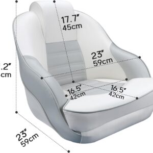 Great Design- Engineered with input from spinal surgeons and ergonomic seat expertsFoldable- The boat seat be fold down when not in use,save more space for youMaterial- Compression foam padding remains firm after long-term use, Marine Grade VinylInstallation- Easy to install on any standard 4-bolt swivel or pedestal, 4 stainless steel mounting screws included. No swivel/pedestal includedDimensions- Height: 54cm, Width:59cm, Length: 59cm.