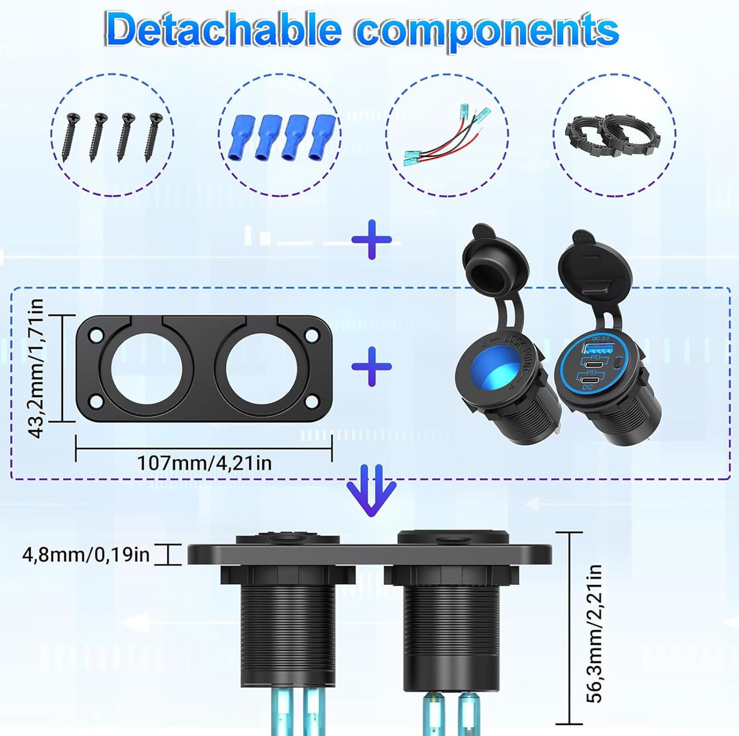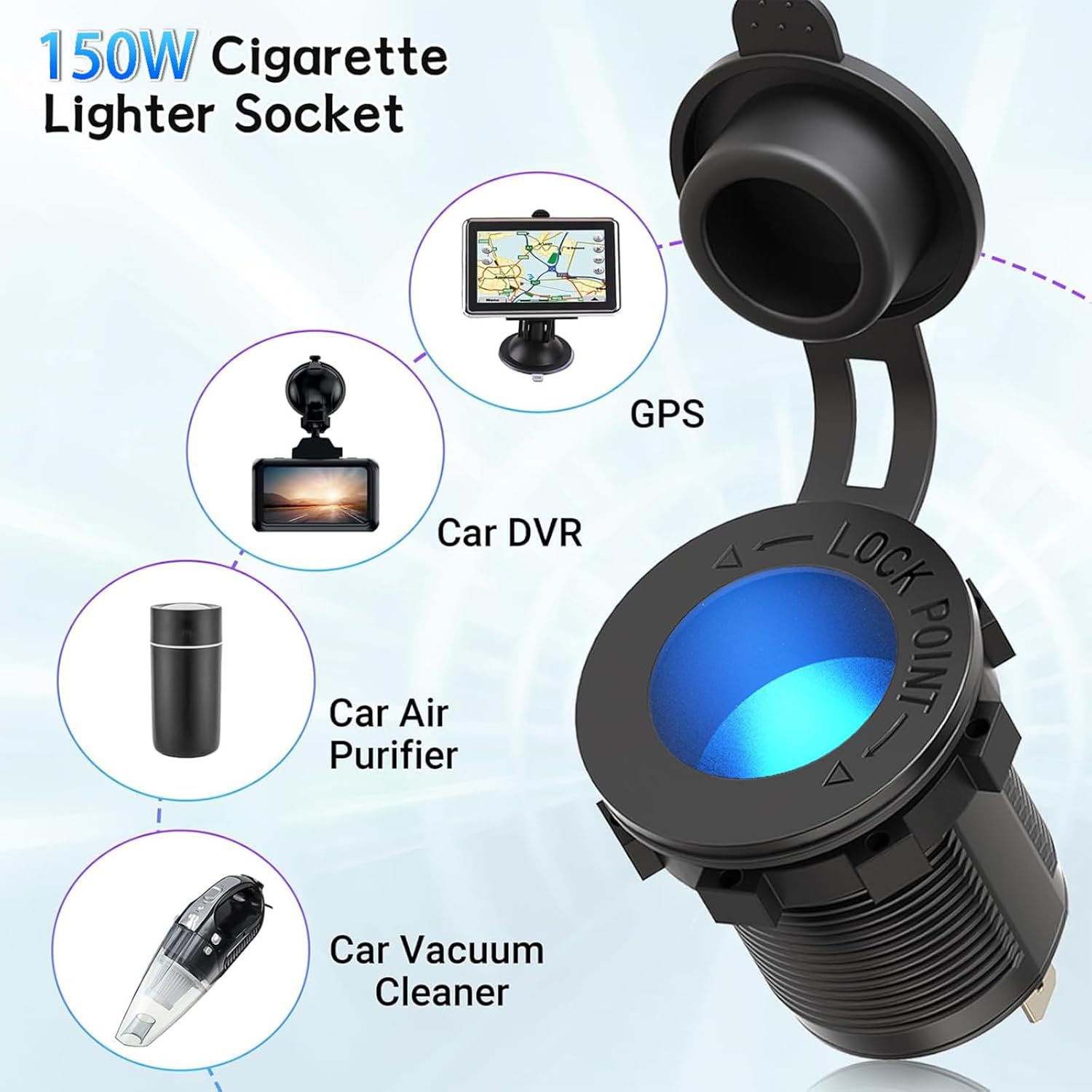 The cigarette lighter socket has a blue light for easy positioning at night. The socket has a total power rating of 120W (12V) / 150W (24V). It is enough for daily use and can be perfectly matched with compatible devices such as dash cam, GPS, vacuum cleaner, air purifier, radar detector and so on.